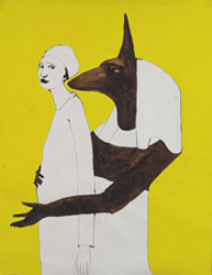 Μέσα από εικόνες δισυπόστατες, μη ξεκάθαρες, τα προσφιλή μοτίβα της καλλιτέχνιδας έρχονται και επανέρχονται βασανιστικά έως ότου τολμήσει κανείς να μπει στον κόσμο τους. Ανθρωπόμορφα ζώα ή υβριδικές μεταλλάξεις ανθρώπου με κεφάλι ζώου, μορφές με περίεργες γκριμάτσες, χωρίς πρόσωπο ή με πρόσωπα των οποίων τα χαρακτηριστικά εσκεμμένα έχουν καλυφθεί ή επιζωγραφιστεί με δυσανάγνωστες γραφές, μουτζούρες ή σκιές? οι ήρωες των έργων της καλλιτέχνιδας, κάτω από περίεργες γωνίες οράσεως ιδωμένοι, αποτελούν οπτικούς γρίφους. Έντονα εξπρεσιονιστικές μορφές, εκφράζουν άλλοτε φόβο, τρόμο, χλευασμό, έντονο σκεπτικισμό-προβληματισμό ή ενίοτε μια παγερή ψυχρότητα, παντελή έλλειψη - απουσία συναισθήματος, μέσα από λευκά σαν μούμιες σβησμένα, αχαρακτήριστα πρόσωπα. Η ηλεκτρική λάμπα, γυμνή, α-περίτεχνη επιβάλει το ίδιο βασανιστικό φως όπως και το χρώμα, χρώμα-πυρετός, που χρησιμοποιεί η δημιουργός όταν ξεφεύγει από την απόλυτη διχρωμία του άσπρου-μαύρου. Το σχέδιο ισότιμα κυριαρχεί καθώς η πένα σαν καλέμι χαράσσει στο χαρτί με οξύτητα τα περιγράμματα από τα οποία αναδύονται οι μορφές. Όλα στα άκρα - χρώμα και σχέδιο.