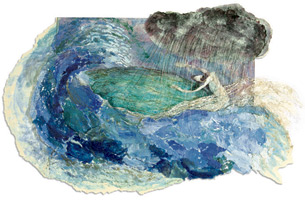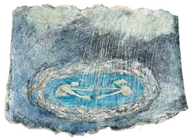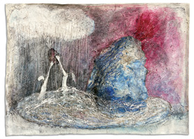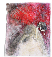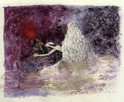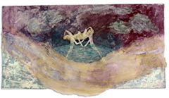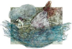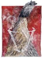 The sense of primitive, primeval, of the basic elements of life and matter, arise through the chromatic scale and her works technical characteristics, on which the artist develops her style of mixed medium techniques and rich materials, in the two-dimensional this time. Human figures remain uncharacterized, anaglyphic, pale-white, reminding us archaic sculptural figures. One could argue that it is Man who lives, runs, penetrates, expresses, lives his/her being, through a dialectic earthly world, alone against natures elements or in counteraction with other figures.
