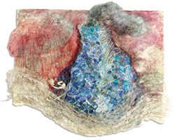 Expressionism enters in a dialogue with Form Geometry. Freedom in vivid lineal elements with jagged outlines and limits, the indifference for the illusion of volume but also the richness of its material, with which the artist creates through a game of unbelievable fantasy using materials such as, synthetic hair, glue, paper, plastic membranes, powder color and cloth: in combination with various chromatic choices which vary from all shades of white and earthly tones, up to the most vibrant reds and most wet sky blues, create a material and discarnate world. In a world and stories of yesterday and today, timeless stories, a world speaking of effort, of existence and of the soul, which might be made out of fire, water, earth, or air.