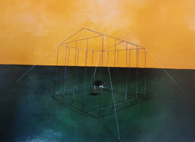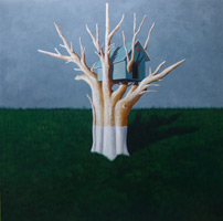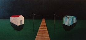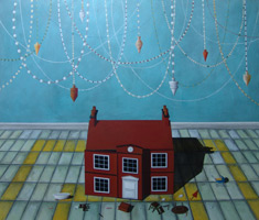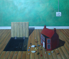 In this exhibition Antonis Papadopoulos presents a unit of painted works and manufactures using the idea of the 'house' as basic theme. This notion is being approached through the prism of sentimental surrealism; humane-shaped works of houses, where the ''outside'' becomes the ''inside''. House presented like a tiny image of our personality within the world. A house that is safe and warm but also a house tightly shut!