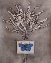 The exhibition comprises 2 different sections of the artists’ works. The first one, occurs to works black and white, with a more savage, expressionistic background, painted with charcoal and oil pastels, and with a small hint of color in details – these are sketches on paper. The second part of artist’s works, is the section of canvas’ paintings, which are painted with acrylic colors and they are characteristic for their vivid bright, sometimes striking, colors and emphasize more in the surrealistic painting techniques. |