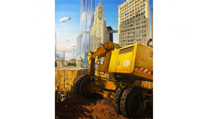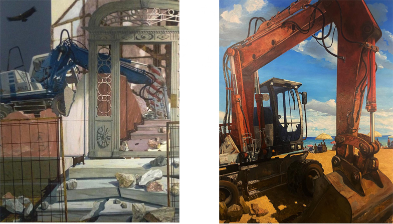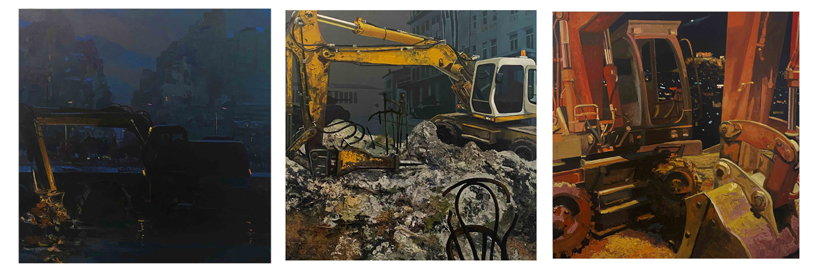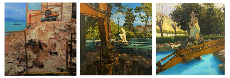 Στην νέα αυτή ενότητα έργων του, ο καταξιωμένος καλλιτέχνης Νικόλας Κληρονόμος εμπνέεται από ένα πολύ ιδιαίτερο θέμα που αντικρύζουμε πλέον καθημερινά, τόσο στις μεγαλουπόλεις όσο και στην ύπαιθρο και δεν είναι άλλο από εικόνες τοπίων με τα επιβλητικά οικοδομικά μηχανήματα, τους Εκσκαφείς, σε πρωταγωνιστικό ρόλο. Ο Εκσκαφέας με την ιδιαίτερη, άκρως ενδιαφέρουσα, καλλιτεχνικά, φόρμα του, σε κάθε έργο υφίσταται ως μια δυναμική οντότητα που ενίοτε προκαλεί δέος, μαγνητίζοντας το βλέμμα του θεατή που περιδιαβαίνοντας τα έργα από το ένα στο άλλο, του αποκαλύπτονται διαφορετικά τοπία, αστικά ή τοπία της υπαίθρου, που το καθένα έχει τη δική του ιδιαιτερότητα, το δικό του απρόσμενο ενδιαφέρον και δείχνουν έναν κόσμο που μεταμορφώνεται. Τον κόσμο του χθες του σήμερα και του αύριο που εν δυνάμει δημιουργείται.